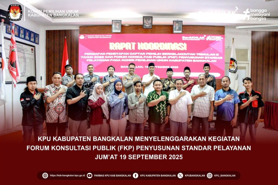 Bangkalan, 19 September 2025 – Komisi Pemilihan Umum (KPU) Kabupaten Bangkalan menyelenggarakan kegiatan Forum Konsultasi Publik (FKP) Penyusunan Standar Pelayanan, Jumat (19/9), bertempat di Aula Meeting Kantor KPU Kabupaten Bangkalan.