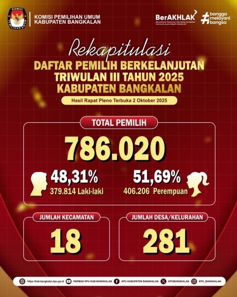 • Total Pemilih: 786.020 (tersebar di 18 kecamatan dan 281 desa/kelurahan).