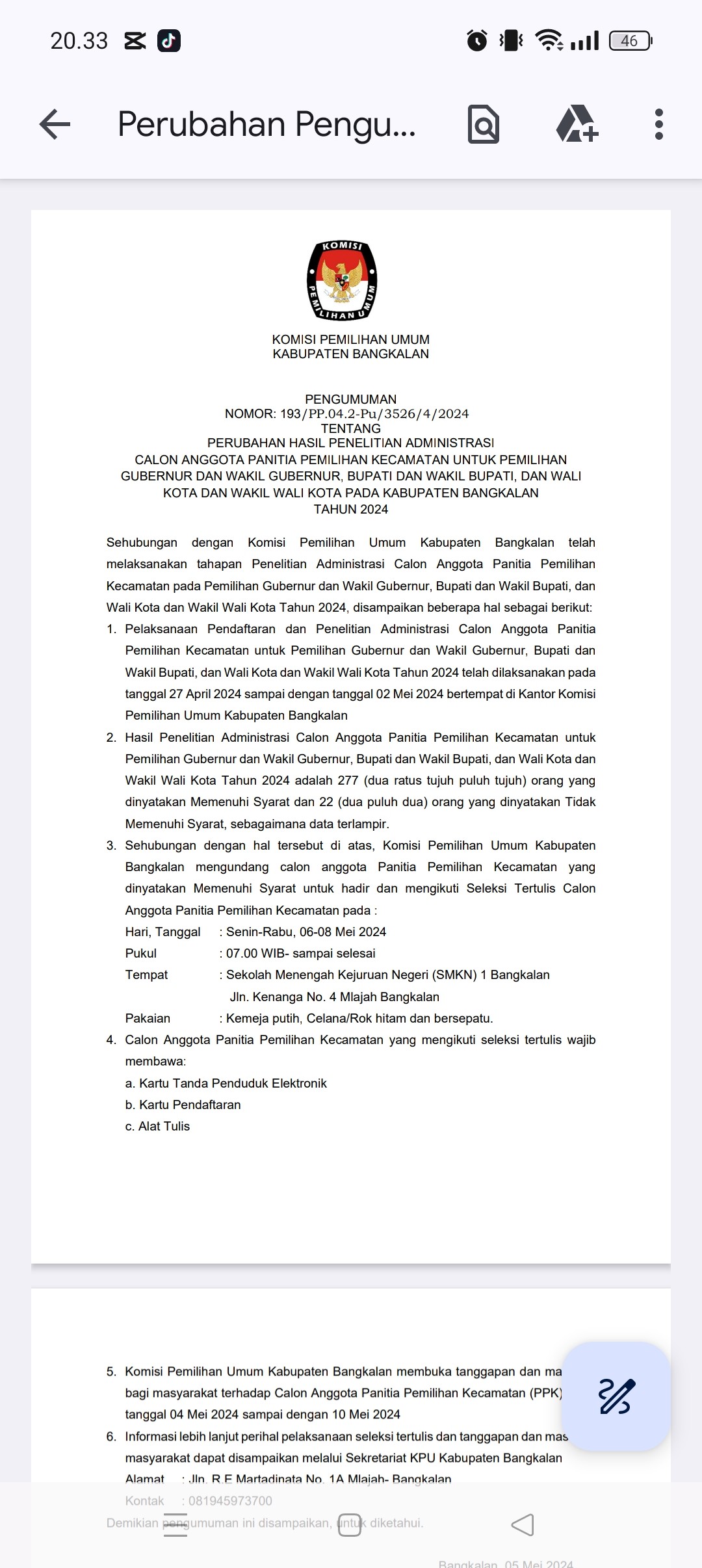Perubahan Pengumuman Hasil Penelitian Administrasi Bakal Calon PPK Pilkada 2024 Minggu, 05 Mei 2024 19:00 186 Perubahan Pengumuman klik disini : Perubahan Pengumuman Baca Selengkapnya