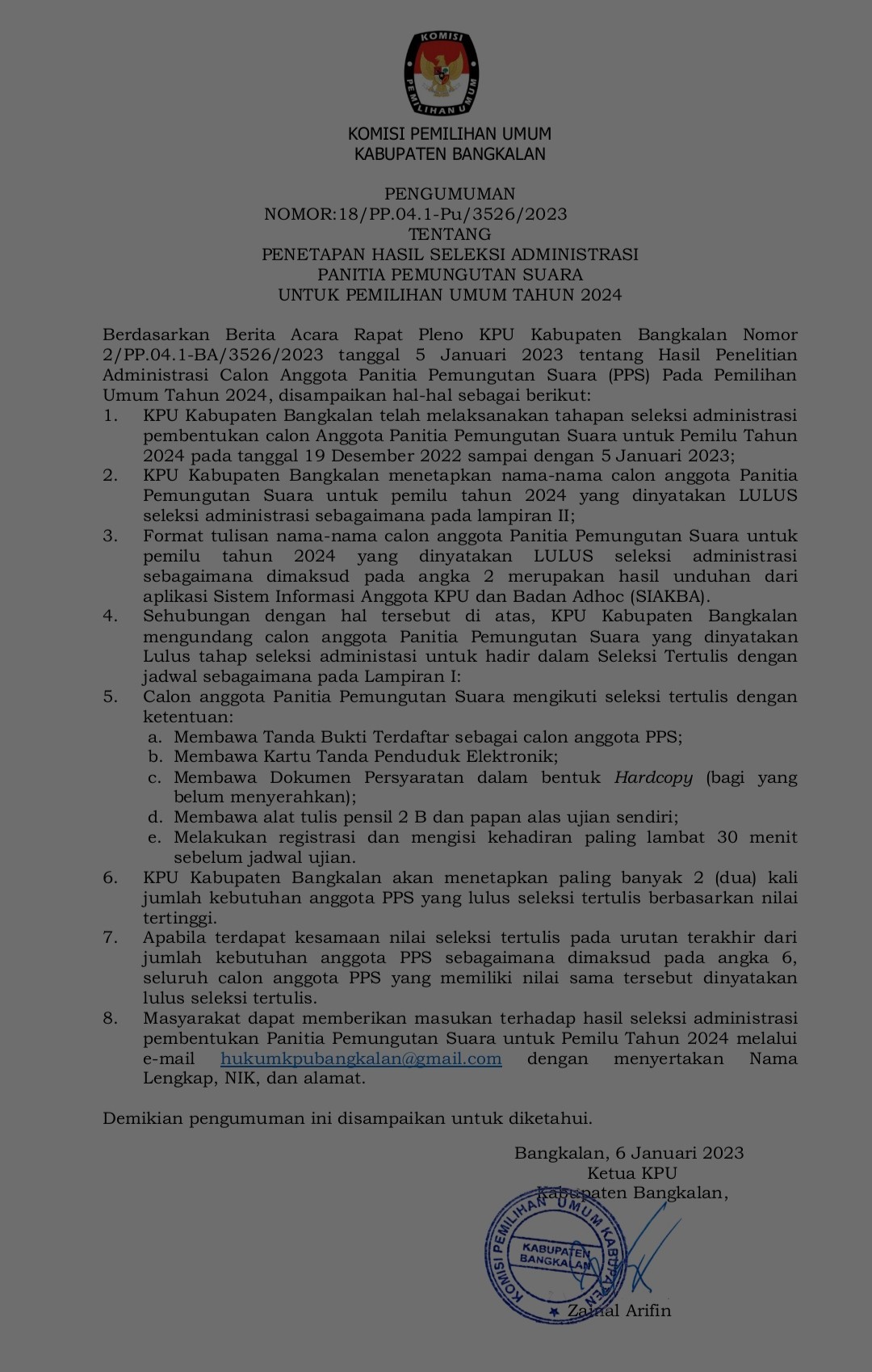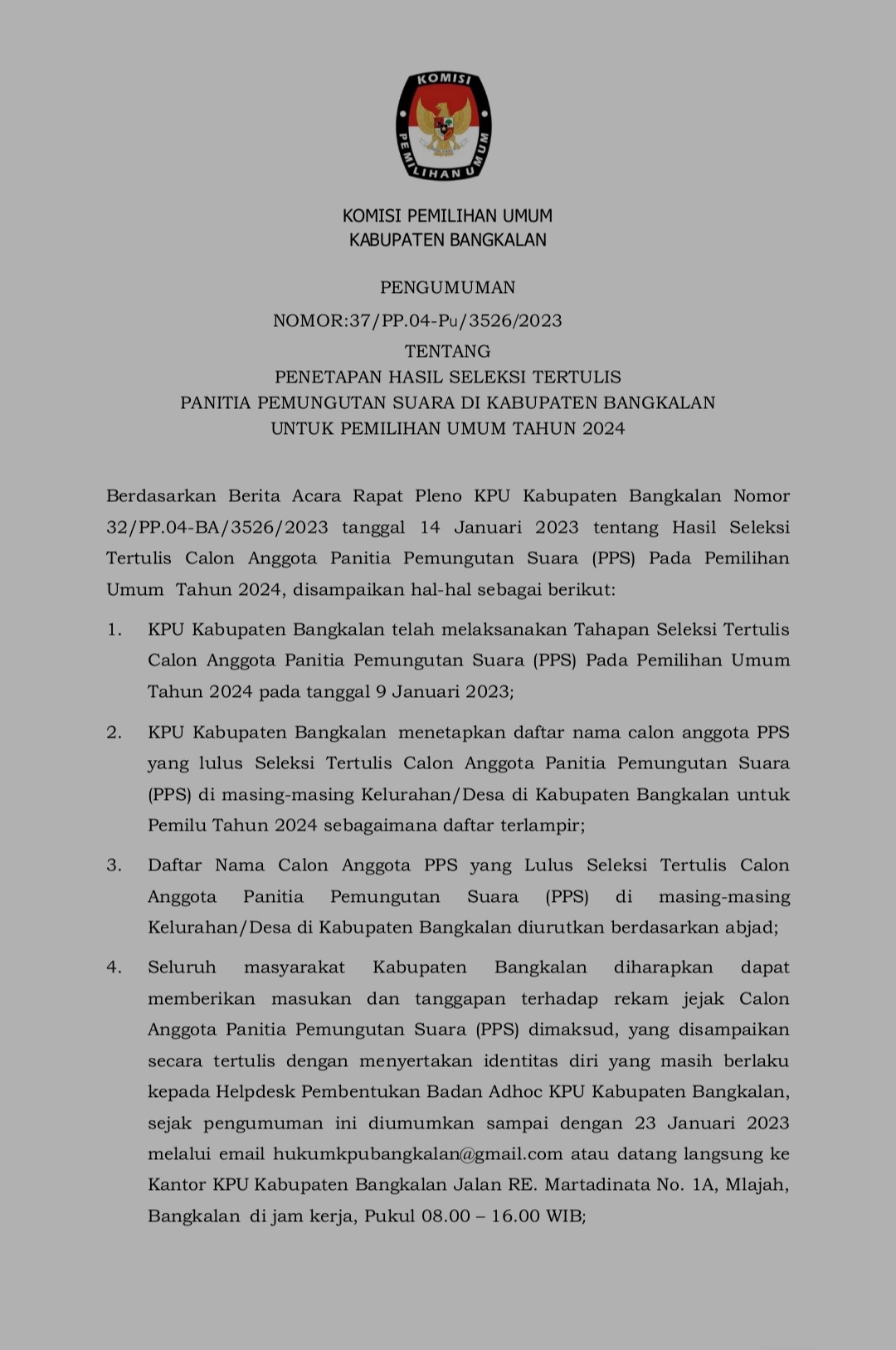 Pengumuman Lolos Seleksi Anggota PPS untuk Pemilu Tahun 2024 Senin, 23 Januari 2023 23:00 346 https://kab-bangkalan.kpu.go.id/public/kab-bangkalan/dmdocument/1674519050PENGUMUMAN HASIL PENETAPAN PPS.pdf Baca Selengkapnya